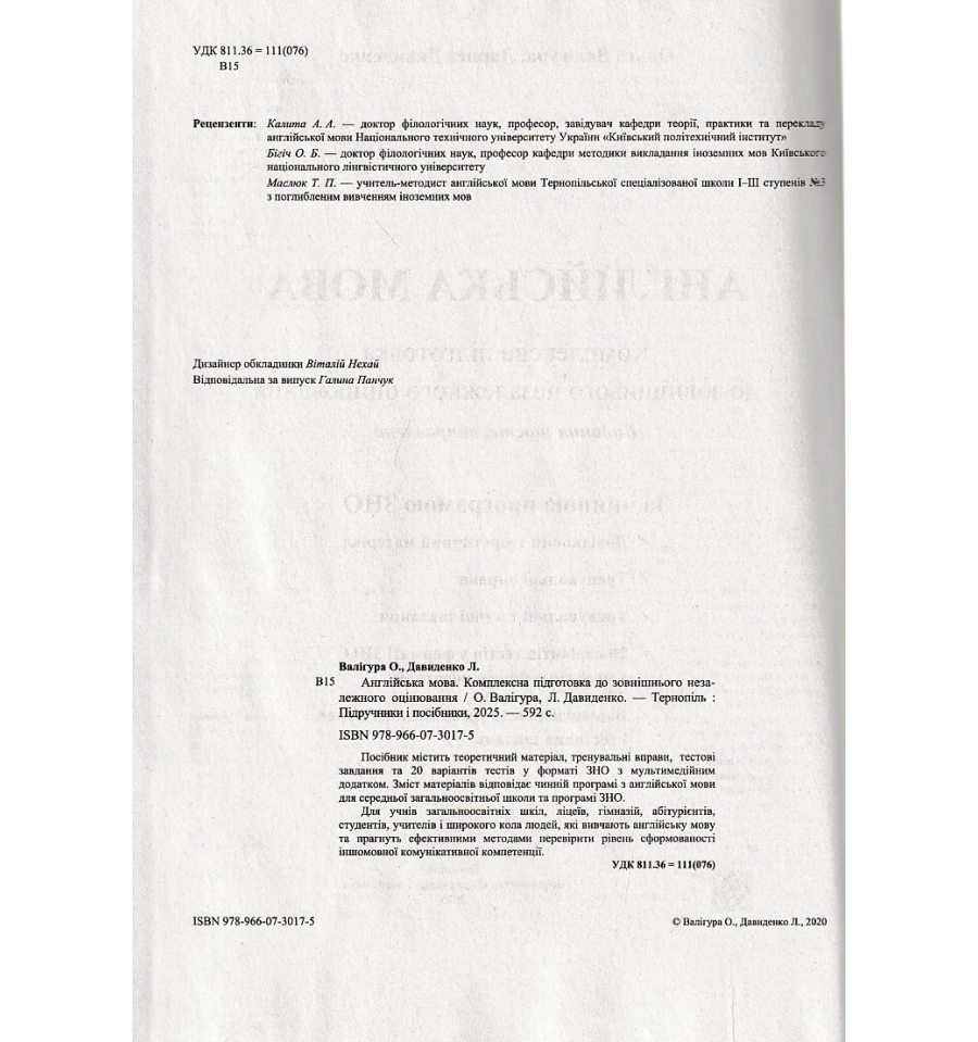 Англійська мова комплексне видання до ЗНО НМТ 2026 автори Валігура Ольга, Давиденко Лариса видавництво «Підручники і посібники» відповідає чинній програмі ЗНО.