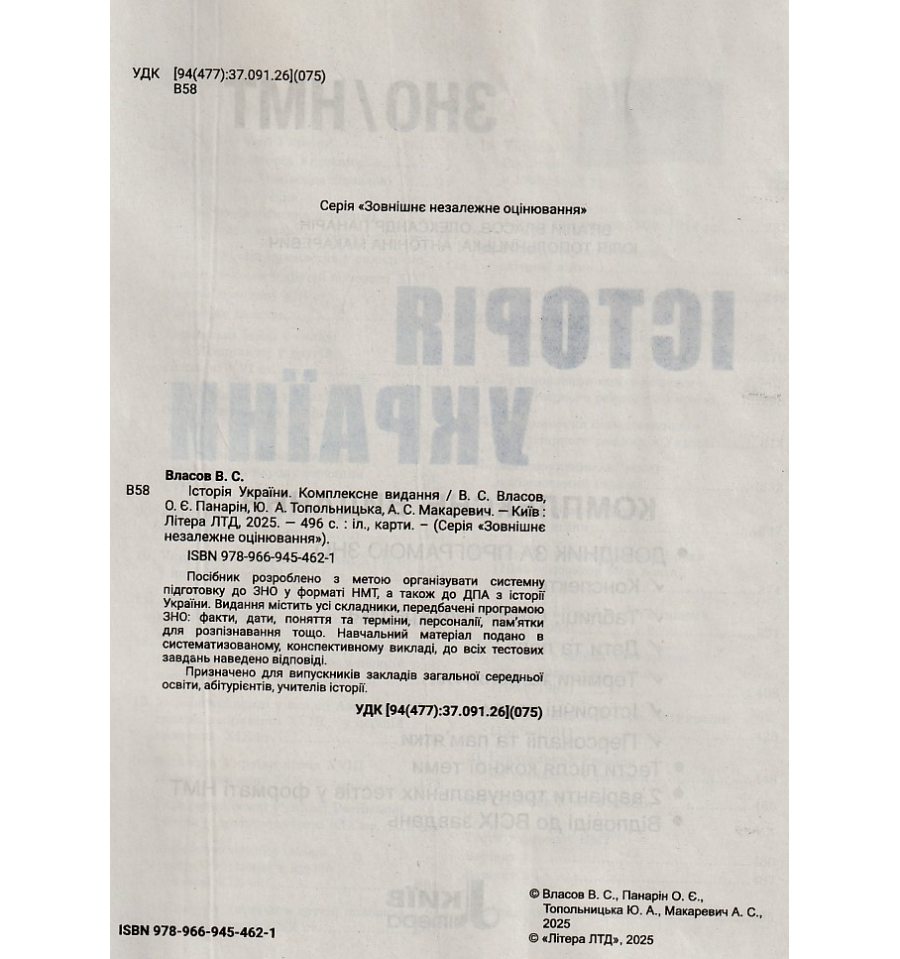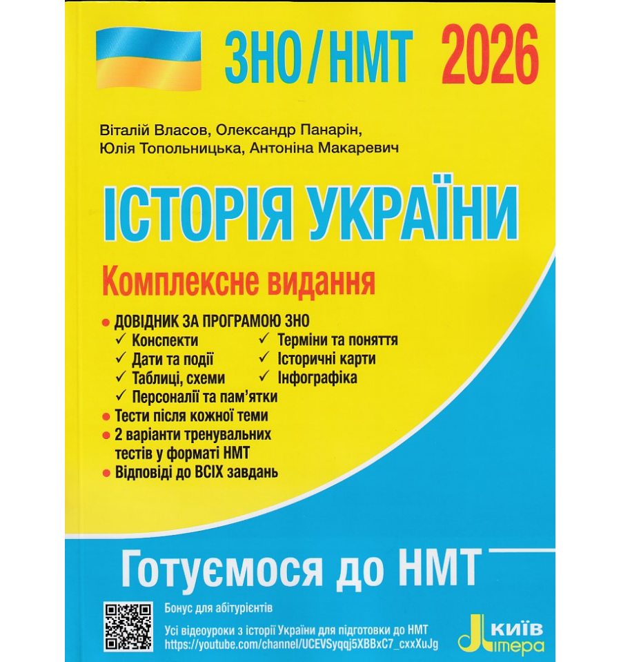 Комплексне видання до ЗНО НМТ 2026 з історії України авторів Власов В., Панарін О. видавництва «Літера ЛТД» міста Київ може запропонувати випускникам 2026 року ґрунтовну підготовку з даного предмета, яка складає наступне: