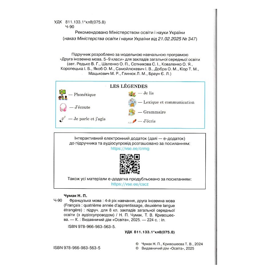Підручник з французької мови для 8 класу НУШ автора Чумак Н. П. видавицтва "Освіта"