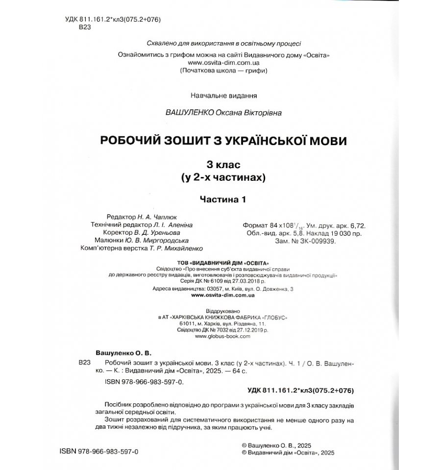 Зошит з української мови з уроками розвитку мовлення для 3 класу НУШ (частина 1) автори Вашуленко, Васильківська видавництво «Освіта» можна купити за оптовою ціною